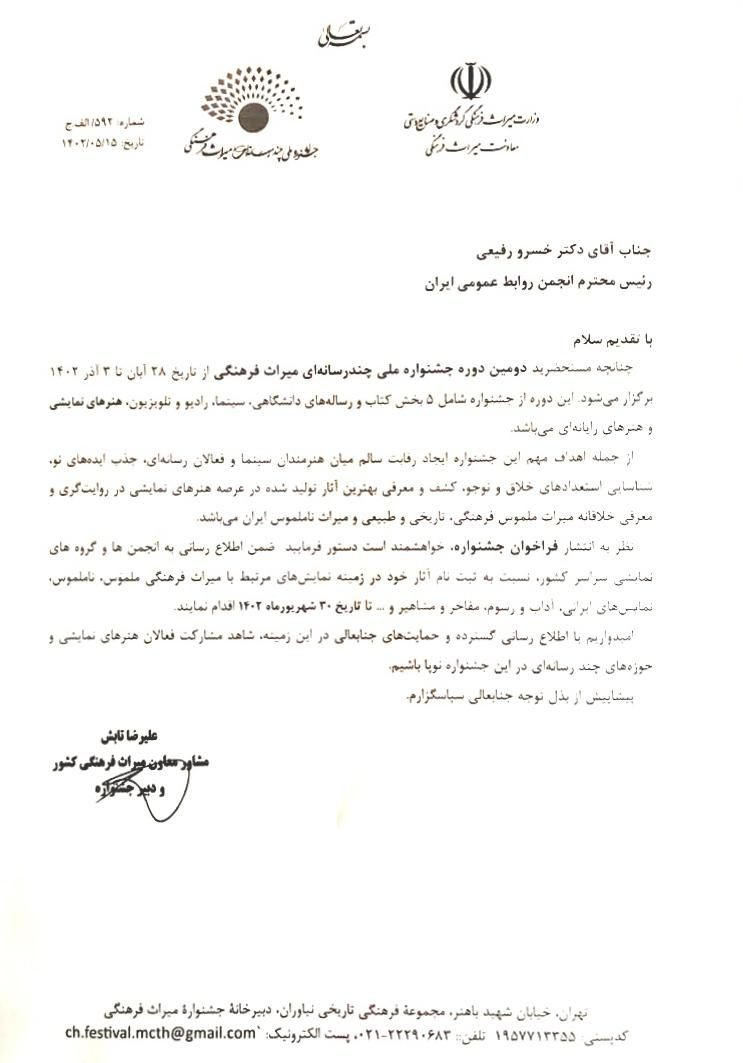 نامه جشنواره رسانه ای میراث فرهنگی به شرح فوق جهت همکاری علاقه مندان تقدیم می شود.